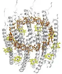 Бактеріохлорофіл — зелений пігмент пурпурних та зелених бактерій, що здатні до фотосинтезу. Локалізований у хроматофорах бактеріальної клітини. Більшість пурпурних бактерій містить бактеріохлорофіл-а,близький до хлорофілу-а зелених рослин. Деякі пурупурні бактерії містять бактеріохлорофіл-b. Зелені бактерії містять бактеріохлорофіл-с, -d або -е які суттєво відрізняються від інших хлорофілів. Незвичайний за будовою хлорофіл-g виділений у облігатно анаеробних фотосинтезуючих бактерій (Heliobacterium chlorum та Heliobacillus mobilis), які виділені у групу геліобактерій. Кожен вид пігменту має свій спектр поглинання, зокрема тип (-а) може поглинати світло з довжиною хвилі до 900 нм, (-b) — до 1100 нм, (-с), (-d) та (-е) — до 840 нм, (-g) максимум поглинання припадає на 790 нм. Здатність поглинати світло у діапазоні 800—1100 нм дає змогу пурпурним бактеріям розвиватись тільки при наявності невидимих оком інфрачервоних променів.