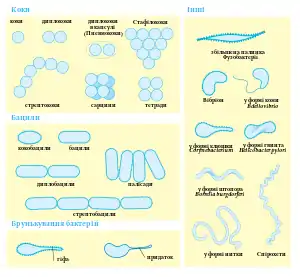 Більшість бактерій мають або сферичну форму — так звані коки (від грецького слова kókkos — зерно або ягода), або паличкоподібну — так звані бацили (від латинського слова bacillus — паличка). Деякі паличкоподібні бактерії (вібріони) дещо зігнуті, а інші формують спіральні завитки (спірохети). Вся ця різноманітність форм бактерій визначається структурою їхньої клітинної стінки та цитоскелету[30]. Ці форми важливі для функціонування бактерій, оскільки вони можуть впливати на здатність бактерій отримувати поживні речовини, прикріплятися до поверхонь, рухатися і рятуватися від хижаків[31].