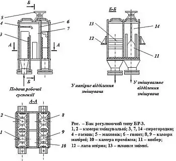 Бак регулюючий типу БР-3 (рис.) служить для розподілу суспензії заданої густини на два регульованих потоки. Змішувальні камери 1 і 2 призначені для прийому робочої суспензії, яка подається насосами по нагнітальних трубопроводах.
