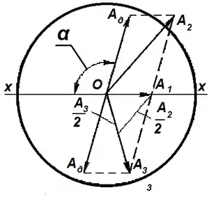 - Робиться засічка радіусом 0,5А3 з початку А1 і радіусом 0,5А2 з її кінця, провести пряму від початку А1 через точку перетину дуг і відкласти на ній кінець вектора А3.