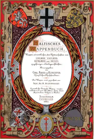 - Klingspor, Carl Arvid von. Baltisches Wappenbuch. Wappen sämmtlicher, den Ritterschaften von Livland, Estland, Kurland und Oesel zugehöriger Adelsgeschlechter. — Stockholm: F. & B. Beijer, 1882.