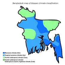 Для Бангладеш характерний типово мусонний клімат. Зими м'які, сухі і сонячні. Середні добові температури січня коливаються в діапазоні від 12 °C до 25 °C. Літо спекотне, дощове, середня температура найспекотнішого місяця — квітня — 23-34 °C.