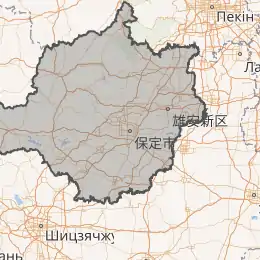 | Note: Baoding New High Technology Product Development Zone (保定高新技术产业开发区) includes Damafang Township (大马坊乡) of Jingxiu District and Jiantai Township (贤台乡) of Mancheng District; the Baigou New City (白沟新城) includes Baigou Town (白沟镇) of Gaobeidian City. | |||||||||||||