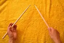 При використанні паличок, в залежності від ситуації і власних уподобань, барабанщик може застосовувати різні хвати паличок, і різні техніки нанесення удару[20].