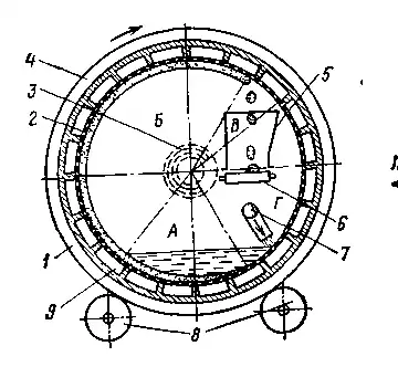 Барабанний вакуум-фільтр з внутрішньою фільтрувальною поверхнею (рис. 2) складається з суцільного барабана 1, на якому закріплені два опорних бандажа 4. Усередині барабана змонтована циліндрична перфорована поверхня 2, обтягнута фільтрувальною тканиною. Тканину закріплюють в спеціально передбачених пазах за допомогою поздовжніх планок. Між фільтрувальною поверхнею і барабаном передбачені порожнини 9, з'єднані трубками з цапфою, до якої притиснута розподільна головка 3. Розподільна головка закриває один кінець барабана, другий кінець якого відкритий і забезпечений кільцевим порогом. Барабан обертається на опорних роликах 8. Обертання від електродвигуна через редуктор передається приводний шестерні барабана.