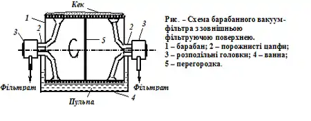 Барабанний вакуум-фільтр із зовнішньою фільтрувальною поверхнею (рис. 1) складається з барабана 1, порожнистих цапф 2, розподільних головок 3, ванни 4. Вертикальна перегородка 5 ділить барабан на дві ізольовані одна від одної половини. Внутрішня порожнина барабана в радіальному напрямку розділена на секції, кожна з яких з'єднана трубами з розподільною головкою.