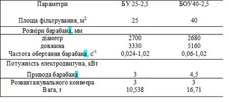 Технічна характеристика барабанного вакуум-фільтру з внутрішньою фільтрувальною поверхнею наведена у таблиці