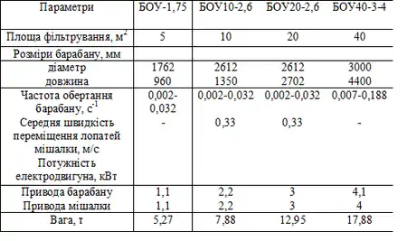 Технічна характеристика барабанного вакуум-фільтра із зовнішньою фільтрувальною поверхнею наведено у таблиці