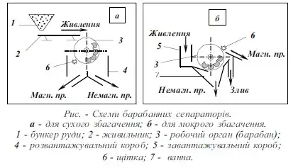 Вихідне живлення в робочу зону сепараторів 3 для сухого збагачення подається переважно механічними живильниками 2, для мокрого — через завантажувальний короб 5. В сепаратори для сухого збагачення живлення подається на барабан, а в сепаратори для мокрого збагачення — під барабан. В робочій зоні магнітні частинки притягуються до барабана і виносяться ним з сепаратора у збірник для концентрату. Немагнітні частинки розвантажуються під дією власної ваги у збірник для відходів. Для збору і розвантаження продуктів сепарації при сухому збагаченні служить короб 4 з розподільчими шиберами, а при мокрому — ванна 7. Магнітний продукт з барабанів знімається щіткою 6 або шкребком.