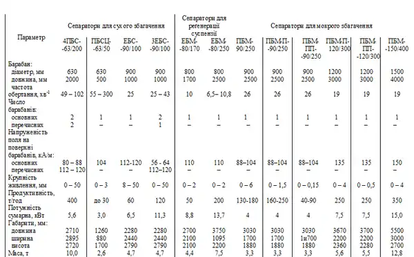 Технічні характеристики барабанних сепараторів для сухого і мокрого збагачення сильномагнітних руд і реґенерації феромагнітних суспензій