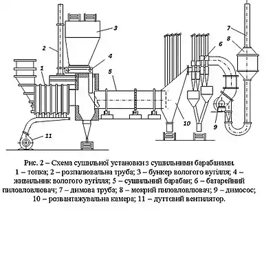 Схема сушильної установки, обладнаної сушильними барабанами, наведена на рис. 2.