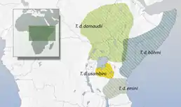 - T. u. boehmi (Fischer & Reichenow, 1884) — південь і схід Ефіопії, південь Сомалі, південний схід Кенії та північний схід Танзанії