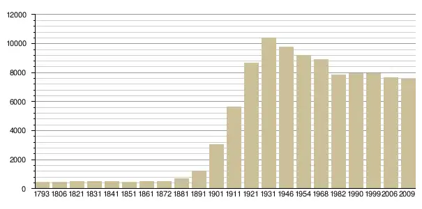 Динаміка населення (base Cassini de l'EHESS pour les nombres retenus jusque 1962[3], base Insee à partir de 1968 (population sans doubles comptes puis population municipale à partir de 2006)[4] · [5] ):