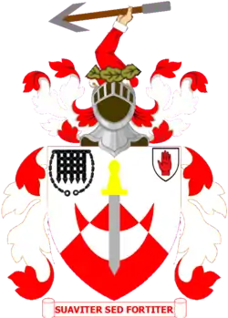 З вінка дубу піднімається права рука з гарпуном, нижче срібний щит з черленим малюнком півмісяця, меча. У верхніх кутах щита зображення «кривавої руки» Ольстера та гратами замкових воріт.