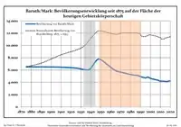 Динаміка населення з 1875 року в сучасних кордонах (Синя лінія: населення; Пунктир: відносна порівняльна динаміка населення землі Бранденбург; Сірий фон: період Третього рейху; Помаранчевий фон: період НДР)