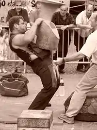 - Арріхасоцайлеак (баск. harrijasotzaileak) — здіймання каміння (кам'яних брил); до цього ж змагання примикають інші зі здіймання важких предметів, наприклад, кінських бричок (баск. orga jokoa) та численні види носіння на швидкість важких предметів, наприклад, «тягання лантухів» (баск. zaku eramatea) або ж змагання з кидання різних предметів, як то ковальських підков (баск. aitzur jaurtiketa);