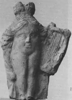 - Гола фігура з арфою, що сидить з розставленими ногами на спині дикого кабана.