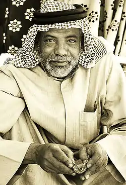 Чоловічий костюм складається з сорочки, шаровар, сандалій та вовняного плаща (у холодну погоду). Як головний убор чоловіки використовують червону чи білу хустину з бавовняної тканини, яка утримується на голові за допомогою джуту, чи білу шапку.
