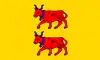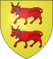 У золотому полі дві червоні корови що йдуть. Роги, нашийники і дзвіночки блакитні.
