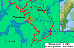 Проходить через озеро Ереше (швед. Öresjö), розташоване на висоті 75,1 м над рівнем моря. Озеро має площу 10,5 км², середня глибина озера становить 10,9 м, максимальна глибина – 32 м. Впадає у фіорд Бюфіорден (швед. Byfjorden) і далі через фіорди навколо острова Уруст – у протоку Каттегат. У гирлі річки лежить місто Уддевалла.