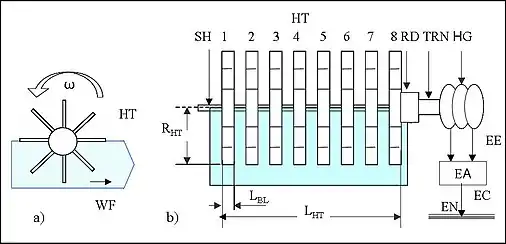 Потужність секційної напівзануреної турбіни визначається геометричними розмірами її конструктивних елементів: радіусом ротора RHT (діаметром 2RHT), шириною лопатей (секції) LBL, кутовою відстанню між лопатями Δα, лінійним зазором між секціями ΔS та числом секцій NS. Величина зазору між секціями ΔS вибирається із умови максимального використання напору водяного потоку. Площа поперечного перетину водяного потоку АHD зв'язана з довжиною гідротурбіни LHT виразом: