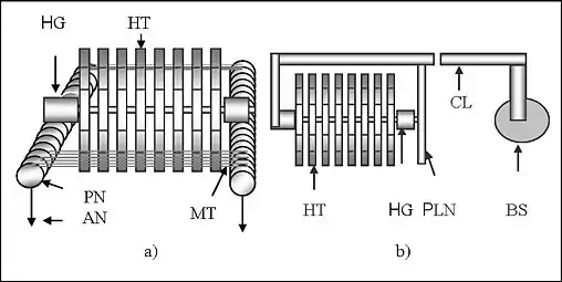 Безгреблева гідроелектростанція на основі напівзанурених гідротурбін - комплекс споруд та обладнання з використанням секційних напівзанурених гідротурбін різної конструкції, з різними способами їх кріплення (фіксації) у водяному потоці, які дозволяють перетворювати енергію плинної води в електрику, не використовуючи греблі. Агрегат з напівзануреною гідротурбіною включає: гідротурбіну HT, трансмісію TRN, редуктор RD, гідрогенератор (електрогенератор) НG та електричний адаптер EА. Гідротурбіна складається з певного числа NS однакових секцій 1, 2, 3, 4, 5, 6, 7, 8, посаджених на спільну вісь SH. Кожна секція турбіни є ротором, на зовнішній частині якого по діаметру закріплені лопаті.