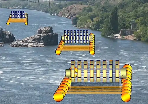 Гідроагрегати каскадної ГЕС з понтонним кріпленням напівзанурених гідротурбін встановлюються вздовж течії один за одним, на відстанях, котрі забезпечують відновлення ламінарного потоку води після проходження ним кожної гідротурбіни.