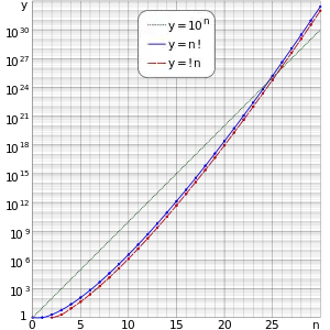 | 23 | 25 852 016 738 884 976 640 000 ≈2.59×1022 | 9 510 425 471 055 777 937 262 ≈9.51×1021 | ≈0.36787 94412 |