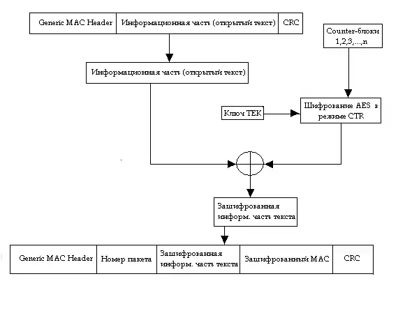 Кожен з n, що залишилися Counter-блоків (нульовий вже був задіяний в шифруванні message authentication code) зашифровують методом AES в режимі CTR з ключем TEK. Потім результат складають побітовим додаванням по модулю два з інформаційною частиною повідомлення. Отриманий зашифрований текст разом із зашифрованим message authentication code, номером пакета даних, заголовком Generic MAC Header і CRC-кінцевиком відправляється на фізичний рівень. При цьому в заголовку GMH поле EC (Encryption Control) встановлюють у одиницю, оскільки дані були зашифровані, а в двухбітовому полі EKS (Encryption Key Sequence) стоїть індекс використаного при цьому ключа TEK (traffic encryption key).