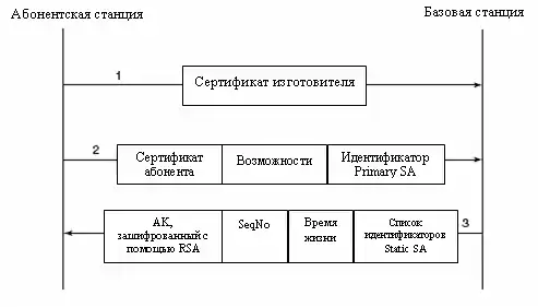 - Відразу після першого повідомлення абонентська станція відправляє повідомлення, що містить сертификат X. 509 самої абонентської станції, її криптографічні можливості й ідентифікатор первинної SA (Primary SA).