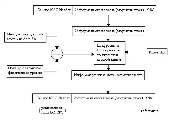 Шифрування даних проходить наступним чином. Вектор ініціалізації з даного data SA і поле синхронізації проходять побітовую операцію, яка виключає АБО подається, як ініціалізований вектор алгоритму DES в режимі зчеплення блоку шифрів (CBC, cipher block chaining). Також на вхід схеми подається ключ TEK для шифрування і відкритий текст повідомлення. Алгоритм видає зашифрований текст. Заголовок Generic MAC header (GMH) не змінюється, за винятком бітового поля EC, а кінцевик CRC, якщо він є, змінюється під зашифрований текст.
