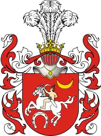 У червоному полі на срібному коні голий вершник з колчаном, який стріляє з лука. Під конем з права срібна підкова сріжками донизу, над конем з ліва золотий півмісяць рогами догори.