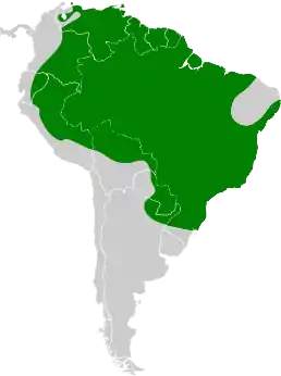 Вид поширений в Південній Америці. Населяє край дощового лісу, вторинні ліси, плантації з тінистими деревами.