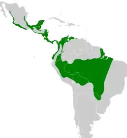 Вид мешкає в лісах від Мексики, через Центральну Америку, до північно-західної та центральної частин Південної Америки (на південь до Парагваю).