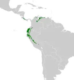 Вид поширений в Центральній і Південній Америці від Нікарагуа на південь до Перу та на схід до Венесуели. Його природні місця проживання- це субтропічні або тропічні сухі ліси та субтропічні або тропічні вологі гірські ліси.