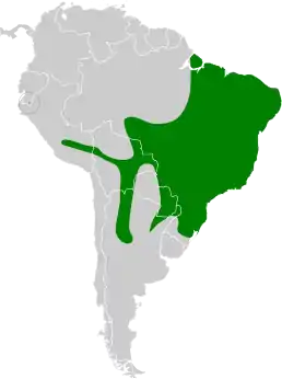 Вид поширений в Південній Америці. Трапляється на сході та півдні Бразилії, в Болівії, Парагваї, на сході Перу та на півночі Аргентини. Його природним середовищем існування є субтропічні або тропічні вологі низинні ліси, субтропічні або тропічні вологі гірські ліси та сильно деградований колишній ліс.