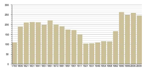 Динаміка населення (base Cassini de l'EHESS pour les nombres retenus jusque 1962[3], base Insee à partir de 1968 (population sans doubles comptes puis population municipale à partir de 2006)[4] · [5] ):