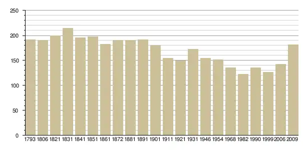 Динаміка населення (base Cassini de l'EHESS pour les nombres retenus jusque 1962[3], base Insee à partir de 1968 (population sans doubles comptes puis population municipale à partir de 2006)[4] · [5] ):