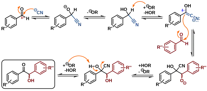 Ключовим кроком в бензоїновій конденсації є умполюнґ карбонільної групи альдегіду-донора в результаті утворення нітрилоеноляту. Через це ціанід-іон є унікальним каталізатором в цій реакції, бо він одночасно виконує всі три важливі функції в її механізмі: 1) нуклеофільне приєднання до карбонільної групи; 2) підвищення кислотності альдегідного атома водню за рахунок її електроноакцепторних властивостей; 3) відщеплення після конденсації з альдегідом-акцептором.