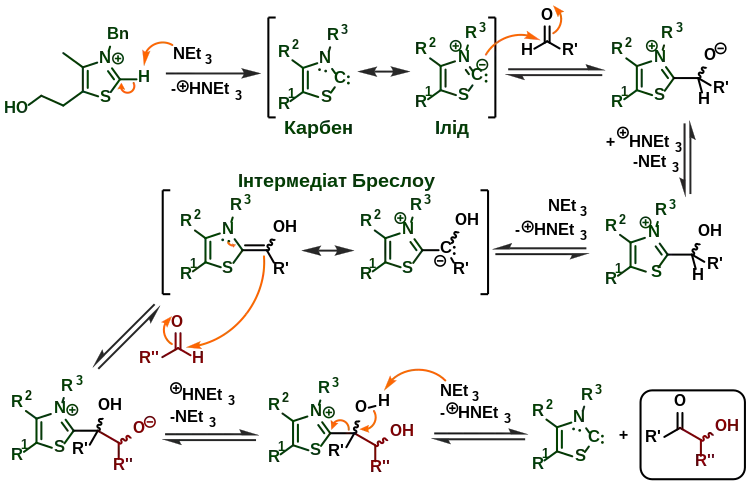 - Breslow, Ronald (1 липня 1958). On the Mechanism of Thiamine Action. IV.1 Evidence from Studies on Model Systems. Journal of the American Chemical Society 80 (14). с. 3719–3726. ISSN 0002-7863. doi:10.1021/ja01547a064.