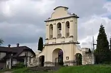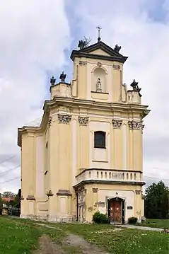 Перед головним фасадом стоїть кам'яна трипролітна дзвіниця, яка складає з костелом єдиний ансамбль. Новий храм постав на місці старого. Опісля його піддавали реставрації у 1903 році.
