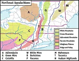 ![]() Північно-східні Аппалачі. Беркшири позначені літерою B Північно-східні Аппалачі. Беркшири позначені літерою B | |