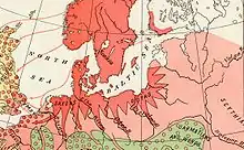 Мапа гіпотетичного розселення германських племен із Скандинавії 1800—100 рр. до н. е. (Madison Grant, The Passing of the Great Race, 1916)
