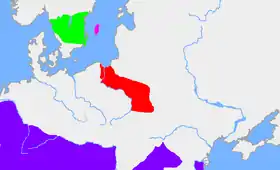| Три корабля, як кажуть, залишили Скандзу, третій з млявими гепідами пристав до берега іншому місці, в гирлі річки Вісла. |