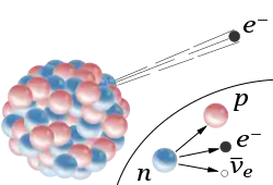При β−-розпаді один нейтрон у складі ядра перетворюється в протон, при цьому вивільняється електрон і електронне антинейтрино.