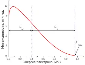 Вільний нейтрон також зазнає β−- розпаду (див. Бета-розпад нейтрона). Це обумовлено тим, що маса нейтрона більша, ніж сумарна маса протона, електрона і антинейтрино. Зв'язаний у ядрі нейтрон може розпадатися цим каналом тільки якщо маса материнського атома Mi більша від маси дочірнього атома Mf (або, загалом, якщо повна енергія початкового стану більша від повної енергії будь-якого з можливих кінцевих станів)[1]. Різницю (Mi − Mf)·c2 = Qβ називають доступною енергією бета-розпаду. Вона збігається з сумарною кінетичною енергією рухомих після розпаду частинок — електрона, антинейтрино і дочірнього ядра (так званого ядра віддачі, чия частка в загальному балансі кінетичної енергії дуже мала, оскільки воно значно масивніше від двох інших частинок). Якщо знехтувати внеском ядра віддачі, то доступна енергія, виділена за бета-розпаду, розподіляється як кінетична енергія між електроном і антинейтрино, причому цей розподіл неперервний: кожна з двох частинок може мати кінетичну енергію в межах від 0 до Qβ. Закон збереження енергії дозволяє β−- розпад лише за невід'ємної Qβ.