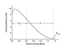 На відміну від альфа-частинок, спектр яких має вираженні піки, спектр бета-частинок є суцільним. Це пов'язано з тим, що при розпаді W-бозону, енергія розподіляється між двома продуктами цього розпаду довільно, і можливі будь-які комбінації енергій нейтрино і електрону. Максимальна енергія бета-частинки залежить від типу розпаду, і дорівнює [M(A, Z)-M(A, Z+1)-me]c2 для β--частинок і [M(A, Z)-M(A, Z-1)-me]c2 для β+-частинок, де M(A, Z) — маса ядра нукліду з порядковим номером Z і кількістю нуклонів A.[3]