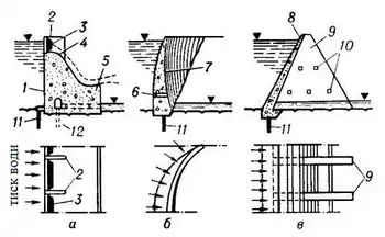 - Контрфорсні греблі мають тонші стінки, ніж гравітаційні греблі, але вони завжди посилюються контрфорсами — боковими стінками, розташованими з боку нижнього б'єфу, що підпирають основну стінку (рис. 1 в).