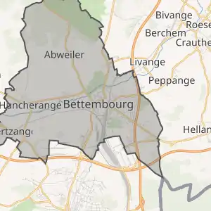 ![]() Комуна Беттембург (помаранчевий), кантон Еш-сюр-Альзетт (темно-червоний) та округ Люксембург (темно-сірий) на карті Люксембургу | ||||