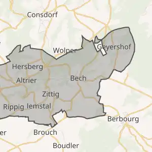 ![]() Комуна Бех (помаранчевий), кантон Ехтернах (темно-червоний) та округ Гревенмахер (темно-сірий) на карті Люксембургу | ||||